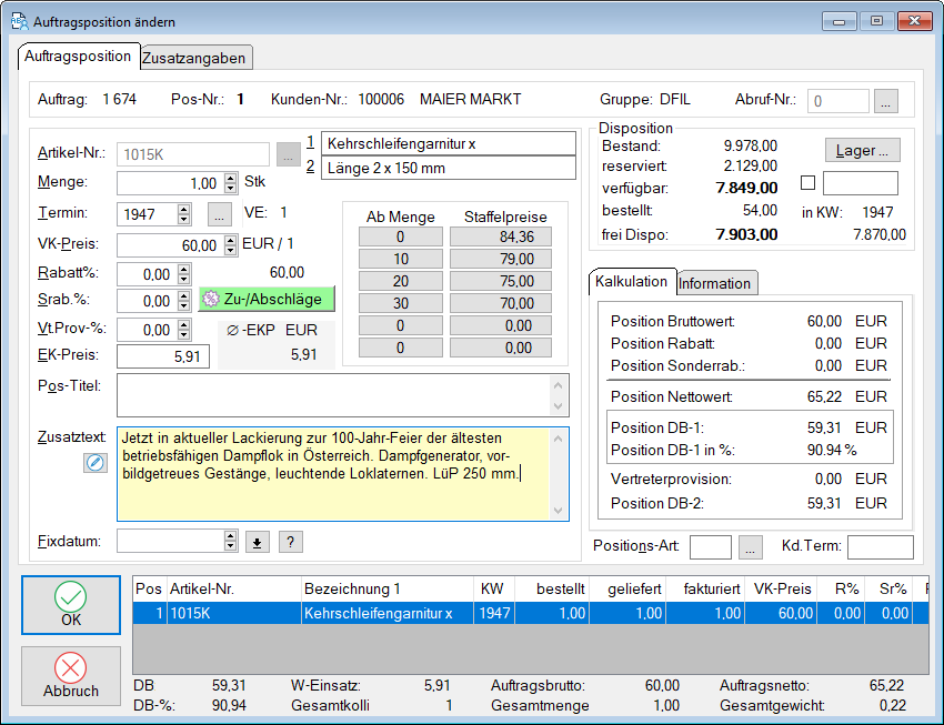Diese Daten werden aus dem Kundenstamm übernommen, allerdings mit der Möglichkeit der auftragsbezogenen Korrektur. Nach der Erfassung des Auftragskopfes können die Positionsdaten eingegeben werden.