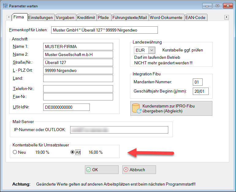 - Danach kann unter Stammdaten->Parameter warten der Standard-Steuersatz auf denneuenMwSt-%-Satzvoreingestellt werden.