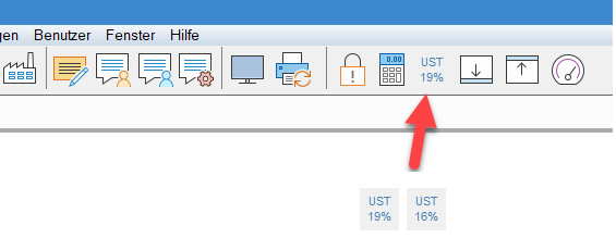 Der jeweils zu verwendende Steuersatz kann pro Benutzer bei Bedarf jederzeit über den „UST“-Toolbar-Icon temporär gewechselt werden (z.B. vor der Erstellung neuer Gutschriften oder Rechnungen und natürlich für Angebote, Auftragsbestätigungen usw.)